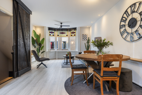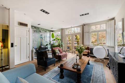 begane grond: zij-entree, hal met hangend toilet, meterkast en cv-ruimte. Mooie, luxe keuken (2024) met een Corian aanrechtblad (wit "terrazzo"), inductie kookplaat, recirculatiekap, koperen kraan en spoelbak, vaatwasser, massief notenhouten laden. Wand met koelkast met vriesvak, combi-magnetron. Groot raam in de zijgevel. Heel gezellige, lichte woonkamer met mooi gekleurde glas-in-lood bovenlichten, grote ramen, trap en een kast.